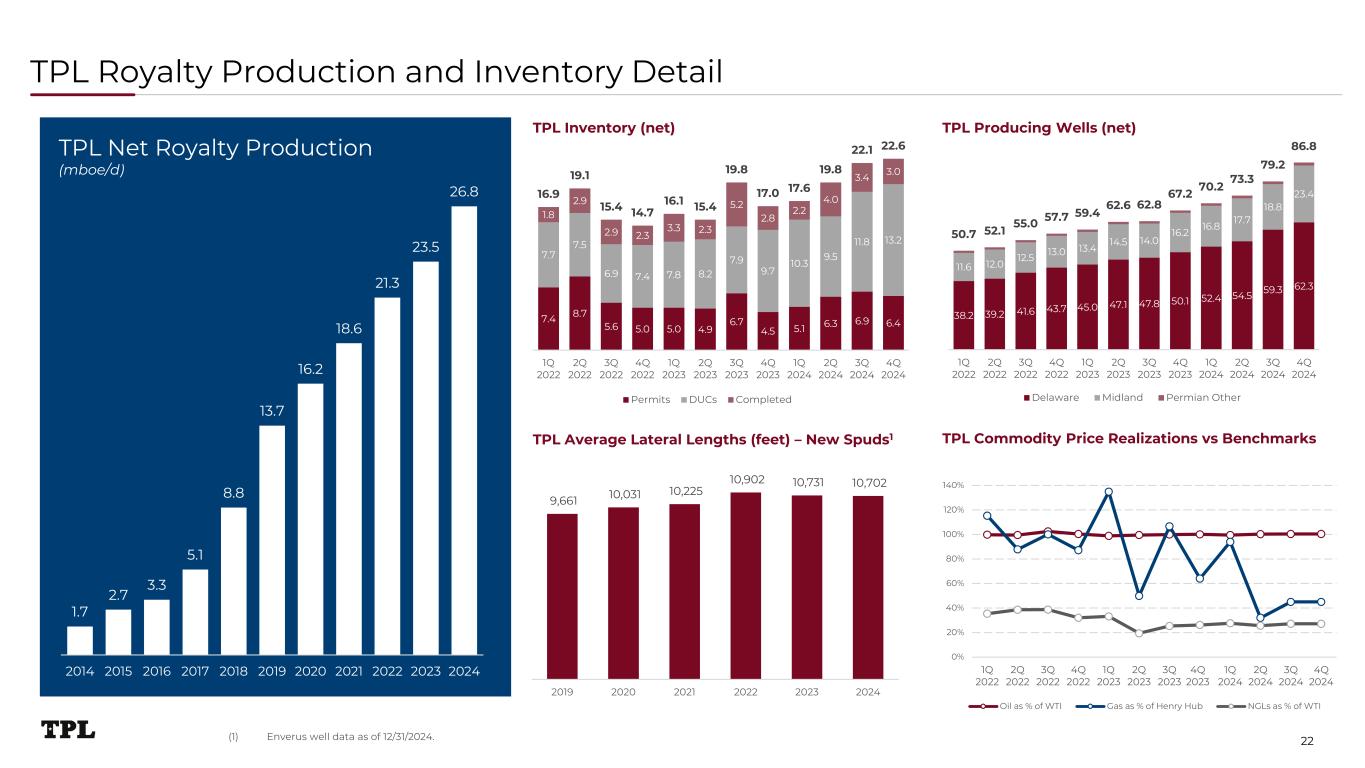 Oil and Gas Royalties Overview and Management 0 500 1,000 1,500 2,000 2,500 3,000 3,500 4,000 4,500 5,000 5,500 6,000 6,500 7,000 Producing Horizontal Wells (Gross) on TPL Oil and Gas Royalty Acreage Revenue Mechanics and Management By interfacing directly with operators across SLEM and Water, TPL incentivizes operators to accelerate development on TPL’s royalty acreage Advocate for royalty ownership during disputes (e.g., revenue deductions, pricing realization, ad valorem payments, etc) Experienced reservoir engineers leverage TPL’s proprietary data for internal initiatives and evaluation of external opportunities Actively monitor check stub accuracy and compliance Internally developed software applications that integrate proprietary and third-party data and software, GIS systems and capabilities, and other tools to help drive further automation, efficiency, and effectiveness Continuously screening for operator well activity updates and utilizing that data to cross-sell TPL services How TPL is Delivering Value Oil and gas royalties represent real property interests entitling the owner to a portion of the proceeds derived from the production of oil and gas TPL receives a percentage of gross revenues from oil and gas wells drilled on TPL royalty acreage Royalties are not burdened by capital costs or most operating expenses (although natural gas and NGLs may have a small set of allowable deductions) associated with well development Mineral and royalty interests exist into perpetuity Overriding royalty interests (“ORRIs”) can be an exception as they are generally tied to leases and may not exist into perpetuity (TPL owns de minimis amount of ORRIs) Responsibility of royalty owner to (i) verify “decimals” (i.e., revenue interest); (ii) ensure timely pay; (iii) inspect check stubs for production, pricing, and deductions accuracy, (iv) track development status of pre-production wells, (v) extract and analyze well reservoir performance 21 Note: Company data as of 12/31/2024.