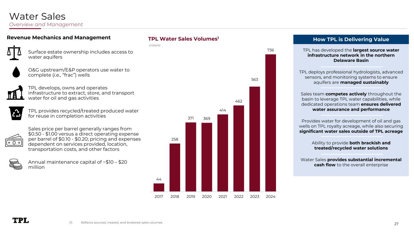 36% 6% 22% 11% 25% $100,000 $115,000 $132,250 Year 0 Year 10 Year 20 Surface, Leases, Easements and Materials (SLEM) Overview and Management $73MM Pipeline easements Caliche / materials Commercial leases Wellbore easements Other Provide operators/customers access-to or use- of TPL surface for infrastructure and materials TPL utilizes standardized forms and payment structures and delivers quick turnaround to operator customers TPL easements typically have initial 10-year term with additional 10-year renewal options for the life of the infrastructure Easement renewal payments generally the greater of 115% or CPI-escalation from the previous easement payment Installed infrastructure tends to be long-lived and/or permanent Amount of revenue opportunities generally correlates to development activity in the Permian Leveraging technology such as advanced GIS, satellite imaging, and automation tools to monitor surface activity Experienced, specialized land asset managers dedicated to all aspects of surface commercialization provide consistent operator interaction, contract execution, and trespass monitoring New activity developments on TPL land is shared across business groups for lead generation and revenue opportunities Employs numerous personnel focused on identifying and developing opportunities for new revenue streams Before active management, operators often trespassed and/or underpaid for activities on TPL land How TPL is Delivering ValueTPL SLEM Revenue Breakdown (FY 2024) Illustrative Easement Renewal Payment Revenue Mechanics and Management Easement contracts generally have two 10-year renewal payments at greater of 115% or CPI-escalation amount 26 Potential for subsequent renewal payments