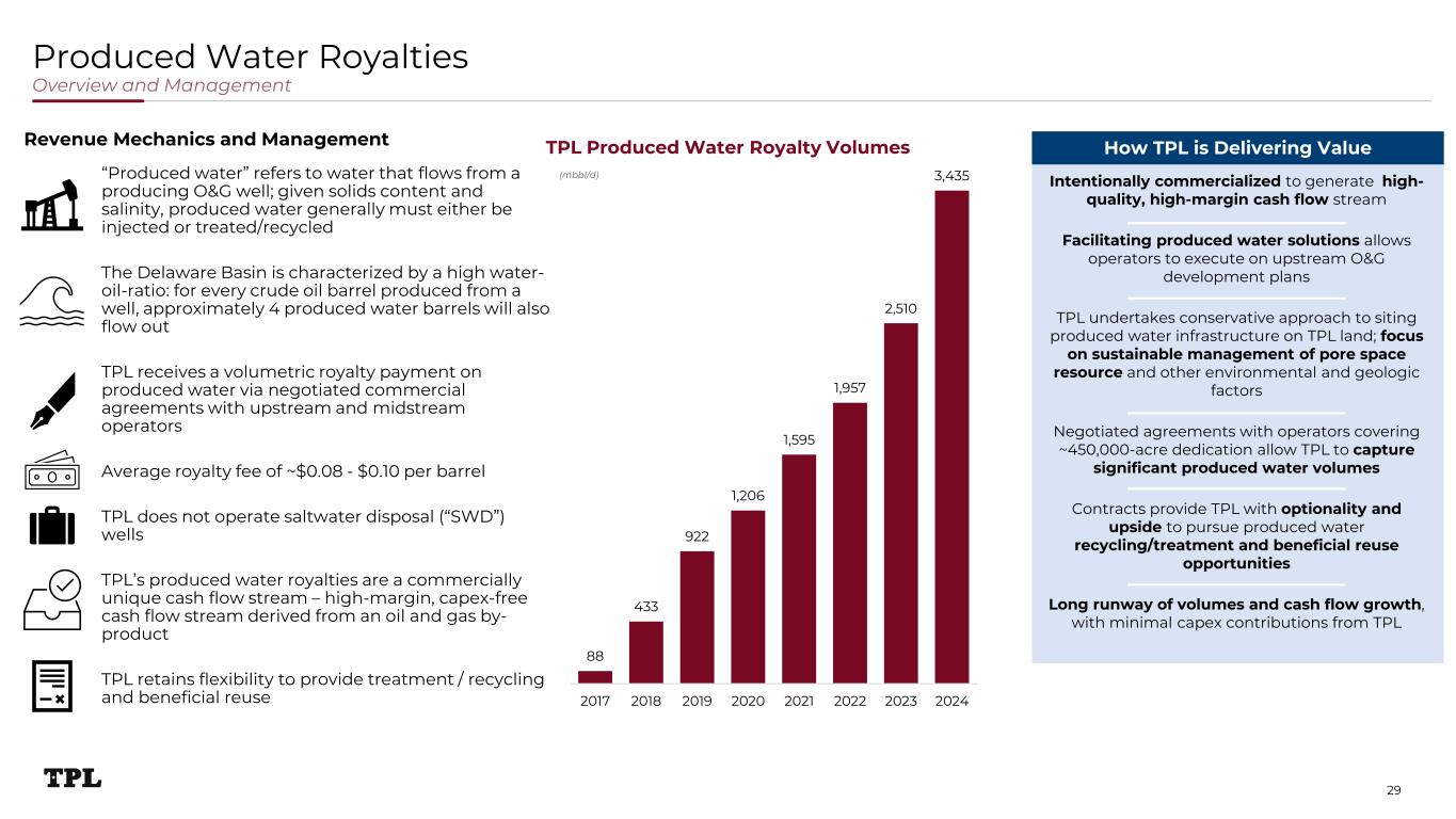 Water Sales Asset Map storage capacity 800+ mbbl/d 34.2 mmbbl source water pipelines445 miles 332 357 393 411 424 455 486 490 2017 2018 2019 2020 2021 2022 2023 2024 Average Fluid Used per Delaware Well Completion Average O&G well in the Delaware requires an increasing volume of water (~500k bbl water per well) TPL has developed and currently operates the largest source water infrastructure network in the northern Delaware TPL sells substantial water both on and off of TPL acreage TPL Source Water Network 28 Note: Enverus and Company data as of 12/31/2024. (mbbls) sourced & treatment capacity