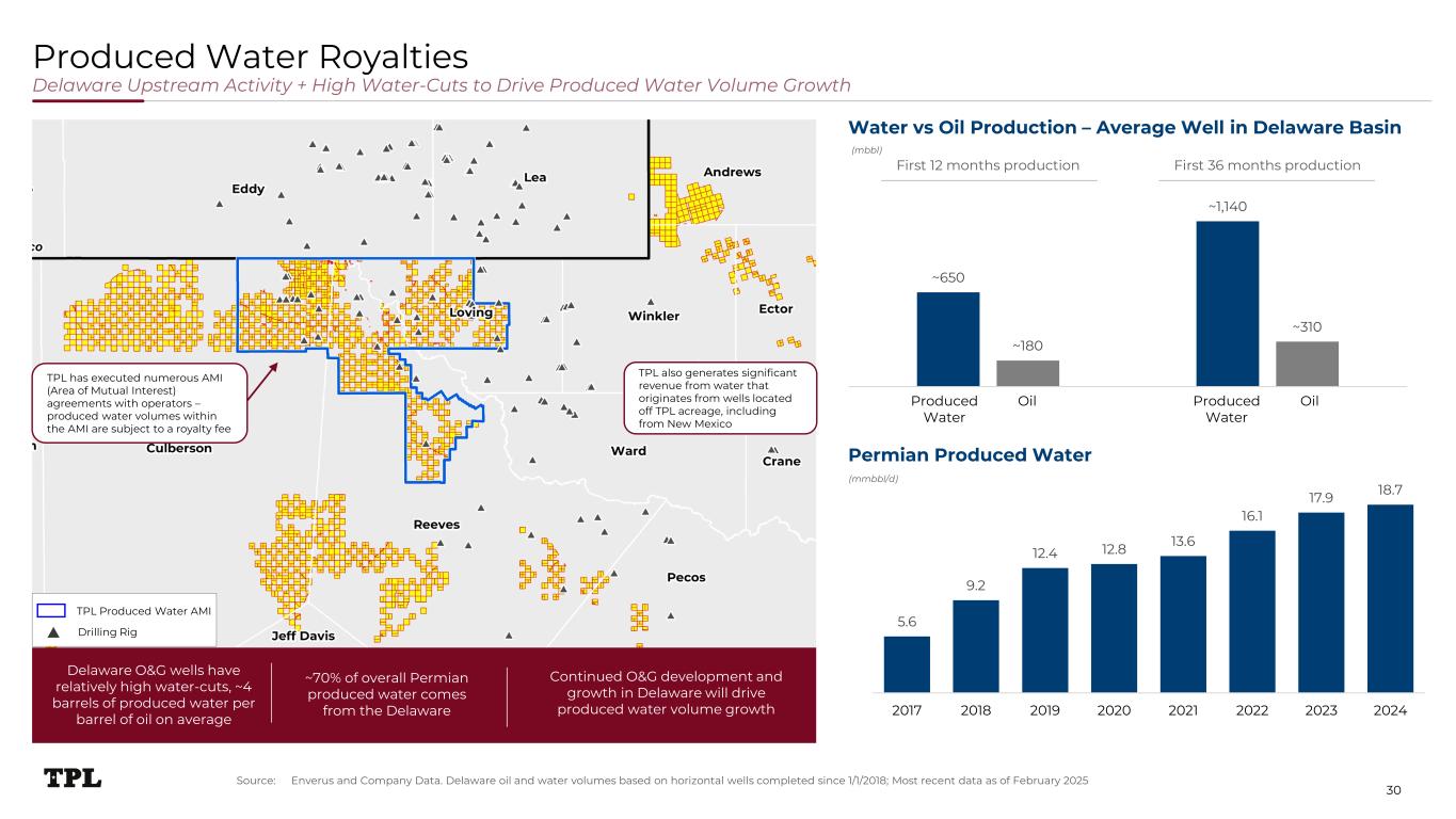 Intentionally commercialized to generate high- quality, high-margin cash flow stream Facilitating produced water solutions allows operators to execute on upstream O&G development plans TPL undertakes conservative approach to siting produced water infrastructure on TPL land; focus on sustainable management of pore space resource and other environmental and geologic factors Negotiated agreements with operators covering ~450,000-acre dedication allow TPL to capture significant produced water volumes Contracts provide TPL with optionality and upside to pursue produced water recycling/treatment and beneficial reuse opportunities Long runway of volumes and cash flow growth, with minimal capex contributions from TPL Produced Water Royalties Overview and Management 88 433 922 1,206 1,595 1,957 2,510 3,435 2017 2018 2019 2020 2021 2022 2023 2024 “Produced water” refers to water that flows from a producing O&G well; given solids content and salinity, produced water generally must either be injected or treated/recycled The Delaware Basin is characterized by a high water- oil-ratio: for every crude oil barrel produced from a well, approximately 4 produced water barrels will also flow out TPL receives a volumetric royalty payment on produced water via negotiated commercial agreements with upstream and midstream operators Average royalty fee of ~$0.08 - $0.10 per barrel TPL does not operate saltwater disposal (“SWD”) wells TPL’s produced water royalties are a commercially unique cash flow stream – high-margin, capex-free cash flow stream derived from an oil and gas by- product TPL retains flexibility to provide treatment / recycling and beneficial reuse How TPL is Delivering ValueRevenue Mechanics and Management TPL Produced Water Royalty Volumes (mbbl/d) 29