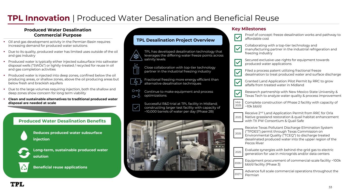 TPL Innovation | Produced Water Desalination and Beneficial Reuse 33 Oil and gas development activity in the Permian Basin requires increasing demand for produced water solutions Due to its quality, produced water has limited uses outside of the oil and gas industry Produced water is typically either injected subsurface into saltwater disposal wells (“SWDs”) or lightly-treated / recycled for reuse in oil and gas completion activities Produced water is injected into deep zones, confined below the oil producing areas, or shallow zones, above the oil producing areas but below fresh and brackish aquifers Due to the large volumes requiring injection, both the shallow and deep zones show concern for long term viability Clean and sustainable alternatives to traditional produced water disposal are needed at scale Produced Water Desalination Commercial Purpose Reduces produced water subsurface injection Long-term, sustainable produced water solution Beneficial reuse applications Produced Water Desalination Benefits TPL has developed desalination technology that leverages the differing water freeze points across salinity levels Close collaboration with top-tier technology partner in the industrial freezing industry Fractional freezing more energy efficient than alternative desalination techniques Continue to make equipment and process optimizations Successful R&D trial at TPL facility in Midland; constructing larger test facility with capacity of ~10,000 barrels of water per day (Phase 2B) TPL Desalination Project Overview Proof of concept: freeze desalination works and pathway to affordable cost Collaborating with a top-tier technology and manufacturing partner in the industrial refrigeration and freezing industry Secured exclusive use-rights for equipment towards produced water applications Filed a process patent utilizing fractional freeze desalination to treat produced water and surface discharge Granted Land Application Pilot Permit by RRC to grow alfalfa from treated water in Midland Research partnership with New Mexico State University & Texas Tech to analyze water quality & process improvement Complete construction of Phase 2 facility with capacity of ~10k bbl/d Receive 2nd Land Application Permit from RRC for Orla Native grassland restoration & quail habitat enhancement with TX PW Consortium & Quail Safe Receive Texas Pollutant Discharge Elimination System (“TPDES”) permit through Texas Commission on Environmental Quality (“TCEQ”) to discharge treated desalinated produced water into the upper region of the Pecos River Evaluate synergies with behind-the-grid gas to electric generation for use in microgrids and/or data centers Equipment procurement of commercial-scale facility ~100k bbl/d facility (Phase 3) Advance full scale commercial operations throughout the Permian Key Milestones 2025 2026+ 2027+ 2025 Mid- 2025 2025