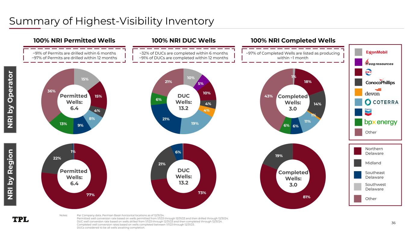 Summary of Highest-Visibility Inventory Notes: Per Company data. Permian Basin horizontal locations as of 12/31/24. Permitted well conversion rate based on wells permitted from 1/1/23 through 12/31/23 and then drilled through 12/31/24. DUC well conversion rate based on wells drilled from 1/1/23 through 12/31/23 and then completed through 12/31/24. Completed well conversion rates based on wells completed between 1/1/23 through 12/31/23 . DUCs considered to be all wells awaiting completion. 100% NRI Permitted Wells 100% NRI DUC Wells 100% NRI Completed Wells 15% 15% 4% 8% 9%13% 36% 77% 22% 1% 10% 5% 10% 4% 4% 19% 21% 6% 21% 73% 21% 6% 81% 19% 1% 18% 14% 1% 11% 6%6% 43% N R I b y R eg io n N R I b y O p er at or ~91% of Permits are drilled within 6 months ~97% of Permits are drilled within 12 months ~32% of DUCs are completed within 6 months ~91% of DUCs are completed within 12 months ~97% of Completed Wells are listed as producing within ~1 month Northern Delaware Other Midland Southeast Delaware Southwest Delaware Permitted Wells: 6.4 DUC Wells: 13.2 Completed Wells: 3.0 Permitted Wells: 6.4 Completed Wells: 3.0 DUC Wells: 13.2 Other 36