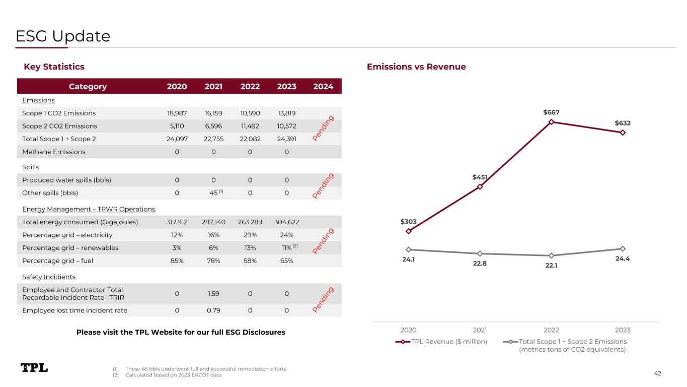 ESG Update Category 2020 2021 2022 2023 2024 Emissions Scope 1 CO2 Emissions 18,987 16,159 10,590 13,819 Scope 2 CO2 Emissions 5,110 6,596 11,492 10,572 Total Scope 1 + Scope 2 24,097 22,755 22,082 24,391 Methane Emissions 0 0 0 0 $303 $451 $667 $632 24.1 22.8 22.1 24.4 0 10 20 30 40 50 60 70 80 $0 $100 $200 $300 $400 $500 $600 $700 $800 2020 2021 2022 2023 TPL Revenue ($ million) Total Scope 1 + Scope 2 Emissions (metrics tons of CO2 equivalents) Emissions vs RevenueKey Statistics Spills Produced water spills (bbls) 0 0 0 0 Other spills (bbls) 0 45 0 0 Please visit the TPL Website for our full ESG Disclosures Energy Management – TPWR Operations Total energy consumed (Gigajoules) 317,912 287,140 263,289 304,622 Percentage grid – electricity 12% 16% 29% 24% Percentage grid – renewables 3% 6% 13% 11% Percentage grid – fuel 85% 78% 58% 65% (1) (2) (1) These 45 bbls underwent full and successful remediation efforts (2) Calculated based on 2023 ERCOT data Safety Incidients Employee and Contractor Total Recordable Incident Rate –TRIR 0 1.59 0 0 Employee lost time incident rate 0 0.79 0 0 42