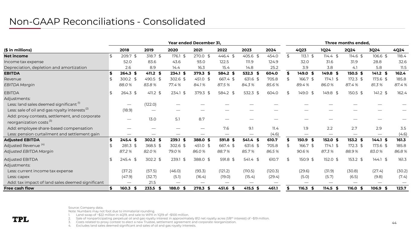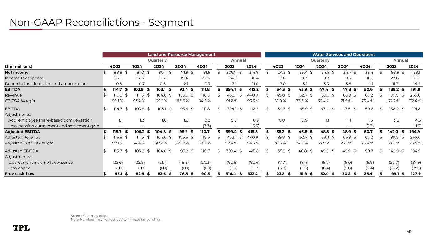 ($ in millions) 2018 2019 2020 2021 2022 2023 2024 4Q23 1Q24 2Q24 3Q24 4Q24 Net income $ 209.7 $ 318.7 $ 176.1 $ 270.0 $ 446.4 $ 405.6 $ 454.0 $ 113.1 $ 114.4 $ 114.6 $ 106.6 $ 118.4 Income tax expense 52.0 83.6 43.6 93.0 122.5 111.9 124.9 32.0 31.6 31.9 28.8 32.6 Depreciation, depletion and amortization 2.6 8.9 14.4 16.3 15.4 14.8 25.2 3.9 3.8 4.1 5.8 11.5 EBITDA $ 264.3 $ 411.2 $ 234.1 $ 379.3 $ 584.2 $ 532.3 $ 604.0 $ 149.0 $ 149.8 $ 150.5 $ 141.2 $ 162.4 Revenue $ 300.2 $ 490.5 $ 302.6 $ 451.0 $ 667.4 $ 631.6 $ 705.8 $ 166.7 $ 174.1 $ 172.3 $ 173.6 $ 185.8 EBITDA Margin 88.0 % 83.8 % 77.4 % 84.1 % 87.5 % 84.3 % 85.6 % 89.4 % 86.0 % 87.4 % 81.3 % 87.4 % EBITDA $ 264.3 $ 411.2 $ 234.1 $ 379.3 $ 584.2 $ 532.3 $ 604.0 $ 149.0 $ 149.8 $ 150.5 $ 141.2 $ 162.4 Adjustments: Less: land sales deemed significant — (122.0) — — — — — — — — — — Less: sale of oil and gas royalty interests (18.9) — — — — — — — — — — — Add: proxy contests, settlement, and corporate reorganization costs — 13.0 5.1 8.7 — — — — — — — — Add: employee share-based compensation — — — — 7.6 9.1 11.4 1.9 2.2 2.7 2.9 3.5 Less: pension curtailment and settlement gain — — — — — — (4.6) — — — — (4.6) Adjusted EBITDA $ 245.4 $ 302.2 $ 239.1 $ 388.0 $ 591.8 $ 541.4 $ 610.7 $ 150.9 $ 152.0 $ 153.2 $ 144.1 $ 161.3 Adjusted Revenue $ 281.3 $ 368.5 $ 302.6 $ 451.0 $ 667.4 $ 631.6 $ 705.8 $ 166.7 $ 174.1 $ 172.3 $ 173.6 $ 185.8 Adjusted EBITDA Margin 87.2 % 82.0 % 79.0 % 86.0 % 88.7 % 85.7 % 86.5 % 90.6 % 87.3 % 88.9 % 83.0 % 86.8 % Adjusted EBITDA $ 245.4 $ 302.2 $ 239.1 $ 388.0 $ 591.8 $ 541.4 $ 610.7 $ 150.9 $ 152.0 $ 153.2 $ 144.1 $ 161.3 Adjustments: Less: current income tax expense (37.2) (57.5) (46.0) (93.3) (121.2) (110.5) (120.3) (29.6) (31.9) (30.8) (27.4) (30.2) Less: capex (47.9) (32.7) (5.1) (16.4) (19.0) (15.4) (29.4) (5.0) (5.7) (6.5) (9.8) (7.4) Add: tax impact of land sales deemed significant — 21.5 — — — — — — — — — — Free cash flow $ 160.3 $ 233.5 $ 188.0 $ 278.3 $ 451.6 $ 415.5 $ 461.1 $ 116.3 $ 114.5 $ 116.0 $ 106.9 $ 123.7 Year ended December 31, Three months ended, Non-GAAP Reconciliations - Consolidated Source: Company data. Note: Numbers may not foot due to immaterial rounding. 1. Land swap of ~$22 million in 4Q19, and sale to WPX in 1Q19 of ~$100 million. 2. Sale of nonparticipating perpetual oil and gas royalty interest in approximately 812 net royalty acres (1/8th interest) of ~$19 million. 3. Costs related to proxy contest to elect a new Trustee, settlement agreement and corporate reorganization. 4. Excludes land sales deemed significant and sales of oil and gas royalty interests. 44 (1) (2) (3) (4)