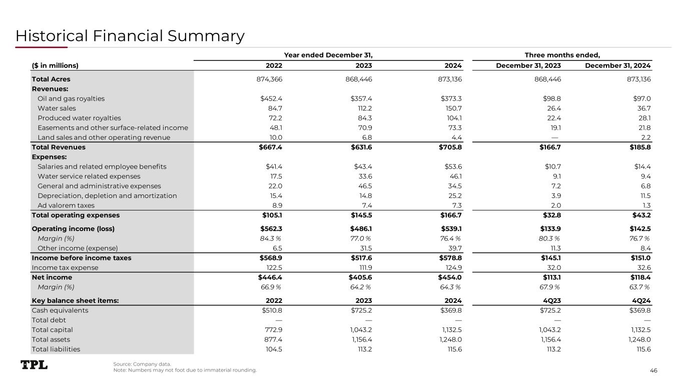 Historical Financial Summary 46 ($ in millions) 2022 2023 2024 December 31, 2023 December 31, 2024 Total Acres 874,366 868,446 873,136 868,446 873,136 Revenues: Oil and gas royalties $452.4 $357.4 $373.3 $98.8 $97.0 Water sales 84.7 112.2 150.7 26.4 36.7 Produced water royalties 72.2 84.3 104.1 22.4 28.1 Easements and other surface-related income 48.1 70.9 73.3 19.1 21.8 Land sales and other operating revenue 10.0 6.8 4.4 — 2.2 Total Revenues $667.4 $631.6 $705.8 $166.7 $185.8 Expenses: Salaries and related employee benefits $41.4 $43.4 $53.6 $10.7 $14.4 Water service related expenses 17.5 33.6 46.1 9.1 9.4 General and administrative expenses 22.0 46.5 34.5 7.2 6.8 Depreciation, depletion and amortization 15.4 14.8 25.2 3.9 11.5 Ad valorem taxes 8.9 7.4 7.3 2.0 1.3 Total operating expenses $105.1 $145.5 $166.7 $32.8 $43.2 Operating income (loss) $562.3 $486.1 $539.1 $133.9 $142.5 Margin (%) 84.3 % 77.0 % 76.4 % 80.3 % 76.7 % Other income (expense) 6.5 31.5 39.7 11.3 8.4 Income before income taxes $568.9 $517.6 $578.8 $145.1 $151.0 Income tax expense 122.5 111.9 124.9 32.0 32.6 Net income $446.4 $405.6 $454.0 $113.1 $118.4 Margin (%) 66.9 % 64.2 % 64.3 % 67.9 % 63.7 % Key balance sheet items: 2022 2023 2024 4Q23 4Q24 Cash equivalents $510.8 $725.2 $369.8 $725.2 $369.8 Total debt — — — — — Total capital 772.9 1,043.2 1,132.5 1,043.2 1,132.5 Total assets 877.4 1,156.4 1,248.0 1,156.4 1,248.0 Total liabilities 104.5 113.2 115.6 113.2 115.6 Three months ended,Year ended December 31, Source: Company data. Note: Numbers may not foot due to immaterial rounding.