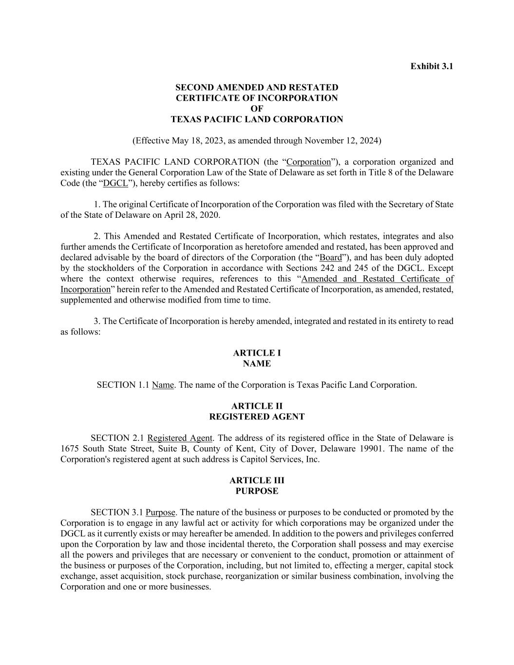 Exhibit 3.1 SECOND AMENDED AND RESTATED CERTIFICATE OF INCORPORATION OF TEXAS PACIFIC LAND CORPORATION (Effective May 18, 2023, as amended through November 12, 2024) TEXAS PACIFIC LAND CORPORATION (the “Corporation”), a corporation organized and existing under the General Corporation Law of the State of Delaware as set forth in Title 8 of the Delaware Code (the “DGCL”), hereby certifies as follows: 1. The original Certificate of Incorporation of the Corporation was filed with the Secretary of State of the State of Delaware on April 28, 2020. 2. This Amended and Restated Certificate of Incorporation, which restates, integrates and also further amends the Certificate of Incorporation as heretofore amended and restated, has been approved and declared advisable by the board of directors of the Corporation (the “Board”), and has been duly adopted by the stockholders of the Corporation in accordance with Sections 242 and 245 of the DGCL. Except where the context otherwise requires, references to this “Amended and Restated Certificate of Incorporation” herein refer to the Amended and Restated Certificate of Incorporation, as amended, restated, supplemented and otherwise modified from time to time. 3. The Certificate of Incorporation is hereby amended, integrated and restated in its entirety to read as follows: ARTICLE I NAME SECTION 1.1 Name. The name of the Corporation is Texas Pacific Land Corporation. ARTICLE II REGISTERED AGENT SECTION 2.1 Registered Agent. The address of its registered office in the State of Delaware is 1675 South State Street, Suite B, County of Kent, City of Dover, Delaware 19901. The name of the Corporation's registered agent at such address is Capitol Services, Inc. ARTICLE III PURPOSE SECTION 3.1 Purpose. The nature of the business or purposes to be conducted or promoted by the Corporation is to engage in any lawful act or activity for which corporations may be organized under the DGCL as it currently exists or may hereafter be amended. In addition to the powers and privileges conferred upon the Corporation by law and those incidental thereto, the Corporation shall possess and may exercise all the powers and privileges that are necessary or convenient to the conduct, promotion or attainment of the business or purposes of the Corporation, including, but not limited to, effecting a merger, capital stock exchange, asset acquisition, stock purchase, reorganization or similar business combination, involving the Corporation and one or more businesses.