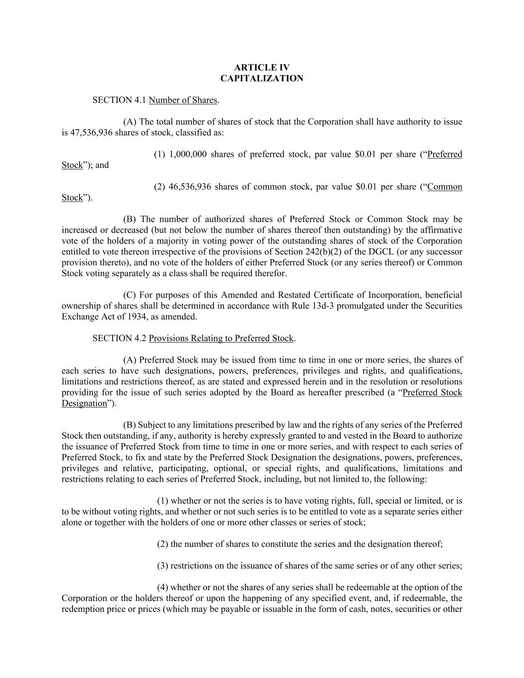 ARTICLE IV CAPITALIZATION SECTION 4.1 Number of Shares. (A) The total number of shares of stock that the Corporation shall have authority to issue is 47,536,936 shares of stock, classified as: (1) 1,000,000 shares of preferred stock, par value $0.01 per share (“Preferred Stock”); and (2) 46,536,936 shares of common stock, par value $0.01 per share (“Common Stock”). (B) The number of authorized shares of Preferred Stock or Common Stock may be increased or decreased (but not below the number of shares thereof then outstanding) by the affirmative vote of the holders of a majority in voting power of the outstanding shares of stock of the Corporation entitled to vote thereon irrespective of the provisions of Section 242(b)(2) of the DGCL (or any successor provision thereto), and no vote of the holders of either Preferred Stock (or any series thereof) or Common Stock voting separately as a class shall be required therefor. (C) For purposes of this Amended and Restated Certificate of Incorporation, beneficial ownership of shares shall be determined in accordance with Rule 13d-3 promulgated under the Securities Exchange Act of 1934, as amended. SECTION 4.2 Provisions Relating to Preferred Stock. (A) Preferred Stock may be issued from time to time in one or more series, the shares of each series to have such designations, powers, preferences, privileges and rights, and qualifications, limitations and restrictions thereof, as are stated and expressed herein and in the resolution or resolutions providing for the issue of such series adopted by the Board as hereafter prescribed (a “Preferred Stock Designation”). (B) Subject to any limitations prescribed by law and the rights of any series of the Preferred Stock then outstanding, if any, authority is hereby expressly granted to and vested in the Board to authorize the issuance of Preferred Stock from time to time in one or more series, and with respect to each series of Preferred Stock, to fix and state by the Preferred Stock Designation the designations, powers, preferences, privileges and relative, participating, optional, or special rights, and qualifications, limitations and restrictions relating to each series of Preferred Stock, including, but not limited to, the following: (1) whether or not the series is to have voting rights, full, special or limited, or is to be without voting rights, and whether or not such series is to be entitled to vote as a separate series either alone or together with the holders of one or more other classes or series of stock; (2) the number of shares to constitute the series and the designation thereof; (3) restrictions on the issuance of shares of the same series or of any other series; (4) whether or not the shares of any series shall be redeemable at the option of the Corporation or the holders thereof or upon the happening of any specified event, and, if redeemable, the redemption price or prices (which may be payable or issuable in the form of cash, notes, securities or other