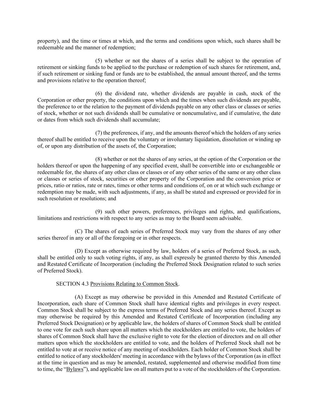 property), and the time or times at which, and the terms and conditions upon which, such shares shall be redeemable and the manner of redemption; (5) whether or not the shares of a series shall be subject to the operation of retirement or sinking funds to be applied to the purchase or redemption of such shares for retirement, and, if such retirement or sinking fund or funds are to be established, the annual amount thereof, and the terms and provisions relative to the operation thereof; (6) the dividend rate, whether dividends are payable in cash, stock of the Corporation or other property, the conditions upon which and the times when such dividends are payable, the preference to or the relation to the payment of dividends payable on any other class or classes or series of stock, whether or not such dividends shall be cumulative or noncumulative, and if cumulative, the date or dates from which such dividends shall accumulate; (7) the preferences, if any, and the amounts thereof which the holders of any series thereof shall be entitled to receive upon the voluntary or involuntary liquidation, dissolution or winding up of, or upon any distribution of the assets of, the Corporation; (8) whether or not the shares of any series, at the option of the Corporation or the holders thereof or upon the happening of any specified event, shall be convertible into or exchangeable or redeemable for, the shares of any other class or classes or of any other series of the same or any other class or classes or series of stock, securities or other property of the Corporation and the conversion price or prices, ratio or ratios, rate or rates, times or other terms and conditions of, on or at which such exchange or redemption may be made, with such adjustments, if any, as shall be stated and expressed or provided for in such resolution or resolutions; and (9) such other powers, preferences, privileges and rights, and qualifications, limitations and restrictions with respect to any series as may to the Board seem advisable. (C) The shares of each series of Preferred Stock may vary from the shares of any other series thereof in any or all of the foregoing or in other respects. (D) Except as otherwise required by law, holders of a series of Preferred Stock, as such, shall be entitled only to such voting rights, if any, as shall expressly be granted thereto by this Amended and Restated Certificate of Incorporation (including the Preferred Stock Designation related to such series of Preferred Stock). SECTION 4.3 Provisions Relating to Common Stock. (A) Except as may otherwise be provided in this Amended and Restated Certificate of Incorporation, each share of Common Stock shall have identical rights and privileges in every respect. Common Stock shall be subject to the express terms of Preferred Stock and any series thereof. Except as may otherwise be required by this Amended and Restated Certificate of Incorporation (including any Preferred Stock Designation) or by applicable law, the holders of shares of Common Stock shall be entitled to one vote for each such share upon all matters which the stockholders are entitled to vote, the holders of shares of Common Stock shall have the exclusive right to vote for the election of directors and on all other matters upon which the stockholders are entitled to vote, and the holders of Preferred Stock shall not be entitled to vote at or receive notice of any meeting of stockholders. Each holder of Common Stock shall be entitled to notice of any stockholders' meeting in accordance with the bylaws of the Corporation (as in effect at the time in question and as may be amended, restated, supplemented and otherwise modified from time to time, the “Bylaws”), and applicable law on all matters put to a vote of the stockholders of the Corporation.