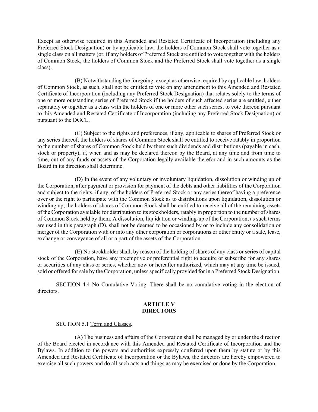 Except as otherwise required in this Amended and Restated Certificate of Incorporation (including any Preferred Stock Designation) or by applicable law, the holders of Common Stock shall vote together as a single class on all matters (or, if any holders of Preferred Stock are entitled to vote together with the holders of Common Stock, the holders of Common Stock and the Preferred Stock shall vote together as a single class). (B) Notwithstanding the foregoing, except as otherwise required by applicable law, holders of Common Stock, as such, shall not be entitled to vote on any amendment to this Amended and Restated Certificate of Incorporation (including any Preferred Stock Designation) that relates solely to the terms of one or more outstanding series of Preferred Stock if the holders of such affected series are entitled, either separately or together as a class with the holders of one or more other such series, to vote thereon pursuant to this Amended and Restated Certificate of Incorporation (including any Preferred Stock Designation) or pursuant to the DGCL. (C) Subject to the rights and preferences, if any, applicable to shares of Preferred Stock or any series thereof, the holders of shares of Common Stock shall be entitled to receive ratably in proportion to the number of shares of Common Stock held by them such dividends and distributions (payable in cash, stock or property), if, when and as may be declared thereon by the Board, at any time and from time to time, out of any funds or assets of the Corporation legally available therefor and in such amounts as the Board in its direction shall determine. (D) In the event of any voluntary or involuntary liquidation, dissolution or winding up of the Corporation, after payment or provision for payment of the debts and other liabilities of the Corporation and subject to the rights, if any, of the holders of Preferred Stock or any series thereof having a preference over or the right to participate with the Common Stock as to distributions upon liquidation, dissolution or winding up, the holders of shares of Common Stock shall be entitled to receive all of the remaining assets of the Corporation available for distribution to its stockholders, ratably in proportion to the number of shares of Common Stock held by them. A dissolution, liquidation or winding-up of the Corporation, as such terms are used in this paragraph (D), shall not be deemed to be occasioned by or to include any consolidation or merger of the Corporation with or into any other corporation or corporations or other entity or a sale, lease, exchange or conveyance of all or a part of the assets of the Corporation. (E) No stockholder shall, by reason of the holding of shares of any class or series of capital stock of the Corporation, have any preemptive or preferential right to acquire or subscribe for any shares or securities of any class or series, whether now or hereafter authorized, which may at any time be issued, sold or offered for sale by the Corporation, unless specifically provided for in a Preferred Stock Designation. SECTION 4.4 No Cumulative Voting. There shall be no cumulative voting in the election of directors. ARTICLE V DIRECTORS SECTION 5.1 Term and Classes. (A) The business and affairs of the Corporation shall be managed by or under the direction of the Board elected in accordance with this Amended and Restated Certificate of Incorporation and the Bylaws. In addition to the powers and authorities expressly conferred upon them by statute or by this Amended and Restated Certificate of Incorporation or the Bylaws, the directors are hereby empowered to exercise all such powers and do all such acts and things as may be exercised or done by the Corporation.
