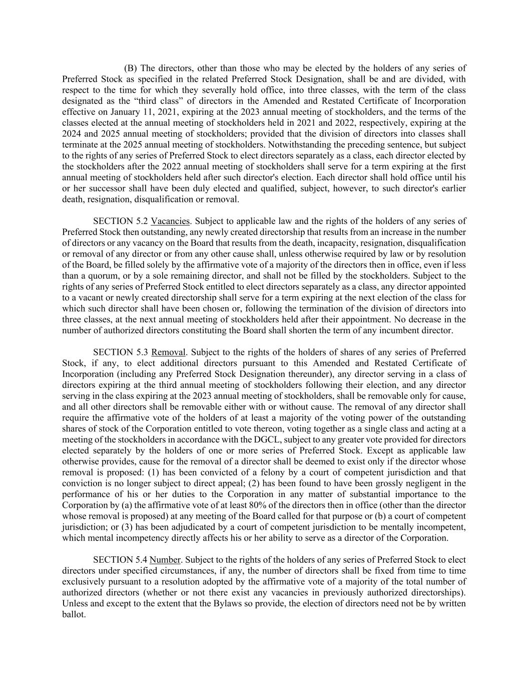 (B) The directors, other than those who may be elected by the holders of any series of Preferred Stock as specified in the related Preferred Stock Designation, shall be and are divided, with respect to the time for which they severally hold office, into three classes, with the term of the class designated as the “third class” of directors in the Amended and Restated Certificate of Incorporation effective on January 11, 2021, expiring at the 2023 annual meeting of stockholders, and the terms of the classes elected at the annual meeting of stockholders held in 2021 and 2022, respectively, expiring at the 2024 and 2025 annual meeting of stockholders; provided that the division of directors into classes shall terminate at the 2025 annual meeting of stockholders. Notwithstanding the preceding sentence, but subject to the rights of any series of Preferred Stock to elect directors separately as a class, each director elected by the stockholders after the 2022 annual meeting of stockholders shall serve for a term expiring at the first annual meeting of stockholders held after such director's election. Each director shall hold office until his or her successor shall have been duly elected and qualified, subject, however, to such director's earlier death, resignation, disqualification or removal. SECTION 5.2 Vacancies. Subject to applicable law and the rights of the holders of any series of Preferred Stock then outstanding, any newly created directorship that results from an increase in the number of directors or any vacancy on the Board that results from the death, incapacity, resignation, disqualification or removal of any director or from any other cause shall, unless otherwise required by law or by resolution of the Board, be filled solely by the affirmative vote of a majority of the directors then in office, even if less than a quorum, or by a sole remaining director, and shall not be filled by the stockholders. Subject to the rights of any series of Preferred Stock entitled to elect directors separately as a class, any director appointed to a vacant or newly created directorship shall serve for a term expiring at the next election of the class for which such director shall have been chosen or, following the termination of the division of directors into three classes, at the next annual meeting of stockholders held after their appointment. No decrease in the number of authorized directors constituting the Board shall shorten the term of any incumbent director. SECTION 5.3 Removal. Subject to the rights of the holders of shares of any series of Preferred Stock, if any, to elect additional directors pursuant to this Amended and Restated Certificate of Incorporation (including any Preferred Stock Designation thereunder), any director serving in a class of directors expiring at the third annual meeting of stockholders following their election, and any director serving in the class expiring at the 2023 annual meeting of stockholders, shall be removable only for cause, and all other directors shall be removable either with or without cause. The removal of any director shall require the affirmative vote of the holders of at least a majority of the voting power of the outstanding shares of stock of the Corporation entitled to vote thereon, voting together as a single class and acting at a meeting of the stockholders in accordance with the DGCL, subject to any greater vote provided for directors elected separately by the holders of one or more series of Preferred Stock. Except as applicable law otherwise provides, cause for the removal of a director shall be deemed to exist only if the director whose removal is proposed: (1) has been convicted of a felony by a court of competent jurisdiction and that conviction is no longer subject to direct appeal; (2) has been found to have been grossly negligent in the performance of his or her duties to the Corporation in any matter of substantial importance to the Corporation by (a) the affirmative vote of at least 80% of the directors then in office (other than the director whose removal is proposed) at any meeting of the Board called for that purpose or (b) a court of competent jurisdiction; or (3) has been adjudicated by a court of competent jurisdiction to be mentally incompetent, which mental incompetency directly affects his or her ability to serve as a director of the Corporation. SECTION 5.4 Number. Subject to the rights of the holders of any series of Preferred Stock to elect directors under specified circumstances, if any, the number of directors shall be fixed from time to time exclusively pursuant to a resolution adopted by the affirmative vote of a majority of the total number of authorized directors (whether or not there exist any vacancies in previously authorized directorships). Unless and except to the extent that the Bylaws so provide, the election of directors need not be by written ballot.