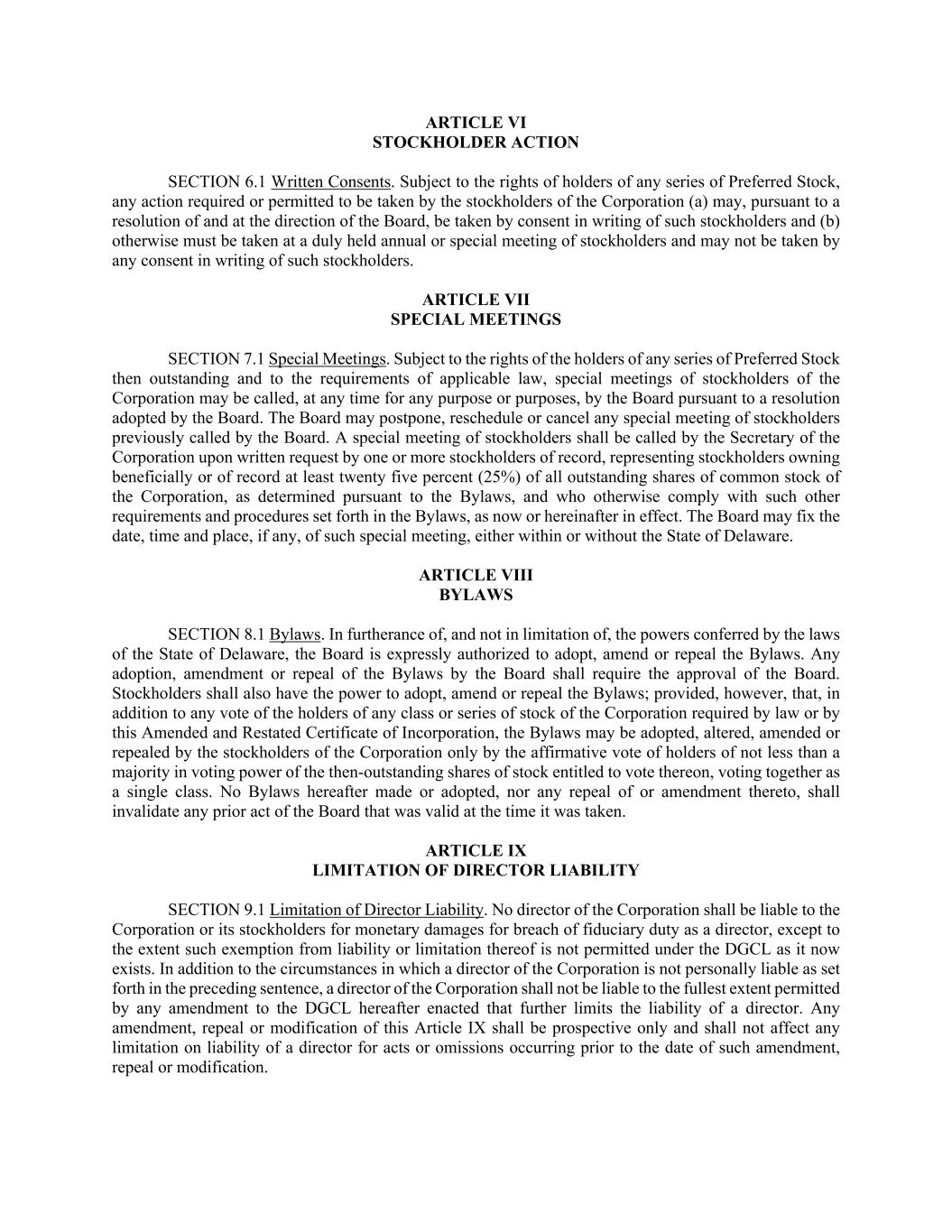 ARTICLE VI STOCKHOLDER ACTION SECTION 6.1 Written Consents. Subject to the rights of holders of any series of Preferred Stock, any action required or permitted to be taken by the stockholders of the Corporation (a) may, pursuant to a resolution of and at the direction of the Board, be taken by consent in writing of such stockholders and (b) otherwise must be taken at a duly held annual or special meeting of stockholders and may not be taken by any consent in writing of such stockholders. ARTICLE VII SPECIAL MEETINGS SECTION 7.1 Special Meetings. Subject to the rights of the holders of any series of Preferred Stock then outstanding and to the requirements of applicable law, special meetings of stockholders of the Corporation may be called, at any time for any purpose or purposes, by the Board pursuant to a resolution adopted by the Board. The Board may postpone, reschedule or cancel any special meeting of stockholders previously called by the Board. A special meeting of stockholders shall be called by the Secretary of the Corporation upon written request by one or more stockholders of record, representing stockholders owning beneficially or of record at least twenty five percent (25%) of all outstanding shares of common stock of the Corporation, as determined pursuant to the Bylaws, and who otherwise comply with such other requirements and procedures set forth in the Bylaws, as now or hereinafter in effect. The Board may fix the date, time and place, if any, of such special meeting, either within or without the State of Delaware. ARTICLE VIII BYLAWS SECTION 8.1 Bylaws. In furtherance of, and not in limitation of, the powers conferred by the laws of the State of Delaware, the Board is expressly authorized to adopt, amend or repeal the Bylaws. Any adoption, amendment or repeal of the Bylaws by the Board shall require the approval of the Board. Stockholders shall also have the power to adopt, amend or repeal the Bylaws; provided, however, that, in addition to any vote of the holders of any class or series of stock of the Corporation required by law or by this Amended and Restated Certificate of Incorporation, the Bylaws may be adopted, altered, amended or repealed by the stockholders of the Corporation only by the affirmative vote of holders of not less than a majority in voting power of the then-outstanding shares of stock entitled to vote thereon, voting together as a single class. No Bylaws hereafter made or adopted, nor any repeal of or amendment thereto, shall invalidate any prior act of the Board that was valid at the time it was taken. ARTICLE IX LIMITATION OF DIRECTOR LIABILITY SECTION 9.1 Limitation of Director Liability. No director of the Corporation shall be liable to the Corporation or its stockholders for monetary damages for breach of fiduciary duty as a director, except to the extent such exemption from liability or limitation thereof is not permitted under the DGCL as it now exists. In addition to the circumstances in which a director of the Corporation is not personally liable as set forth in the preceding sentence, a director of the Corporation shall not be liable to the fullest extent permitted by any amendment to the DGCL hereafter enacted that further limits the liability of a director. Any amendment, repeal or modification of this Article IX shall be prospective only and shall not affect any limitation on liability of a director for acts or omissions occurring prior to the date of such amendment, repeal or modification.