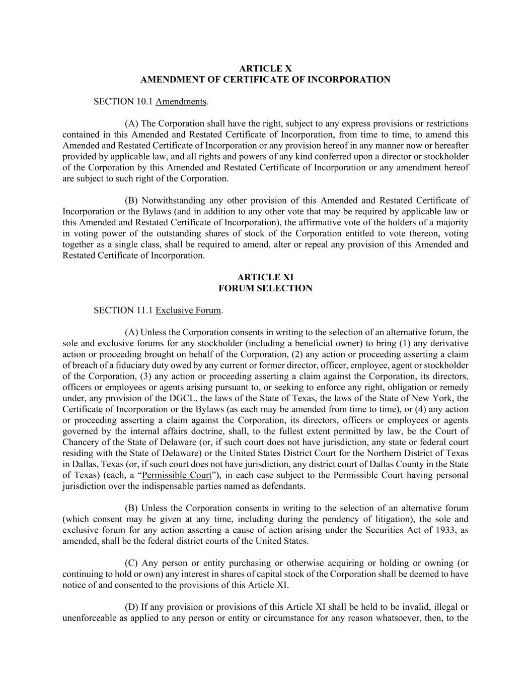 ARTICLE X AMENDMENT OF CERTIFICATE OF INCORPORATION SECTION 10.1 Amendments. (A) The Corporation shall have the right, subject to any express provisions or restrictions contained in this Amended and Restated Certificate of Incorporation, from time to time, to amend this Amended and Restated Certificate of Incorporation or any provision hereof in any manner now or hereafter provided by applicable law, and all rights and powers of any kind conferred upon a director or stockholder of the Corporation by this Amended and Restated Certificate of Incorporation or any amendment hereof are subject to such right of the Corporation. (B) Notwithstanding any other provision of this Amended and Restated Certificate of Incorporation or the Bylaws (and in addition to any other vote that may be required by applicable law or this Amended and Restated Certificate of Incorporation), the affirmative vote of the holders of a majority in voting power of the outstanding shares of stock of the Corporation entitled to vote thereon, voting together as a single class, shall be required to amend, alter or repeal any provision of this Amended and Restated Certificate of Incorporation. ARTICLE XI FORUM SELECTION SECTION 11.1 Exclusive Forum. (A) Unless the Corporation consents in writing to the selection of an alternative forum, the sole and exclusive forums for any stockholder (including a beneficial owner) to bring (1) any derivative action or proceeding brought on behalf of the Corporation, (2) any action or proceeding asserting a claim of breach of a fiduciary duty owed by any current or former director, officer, employee, agent or stockholder of the Corporation, (3) any action or proceeding asserting a claim against the Corporation, its directors, officers or employees or agents arising pursuant to, or seeking to enforce any right, obligation or remedy under, any provision of the DGCL, the laws of the State of Texas, the laws of the State of New York, the Certificate of Incorporation or the Bylaws (as each may be amended from time to time), or (4) any action or proceeding asserting a claim against the Corporation, its directors, officers or employees or agents governed by the internal affairs doctrine, shall, to the fullest extent permitted by law, be the Court of Chancery of the State of Delaware (or, if such court does not have jurisdiction, any state or federal court residing with the State of Delaware) or the United States District Court for the Northern District of Texas in Dallas, Texas (or, if such court does not have jurisdiction, any district court of Dallas County in the State of Texas) (each, a “Permissible Court”), in each case subject to the Permissible Court having personal jurisdiction over the indispensable parties named as defendants. (B) Unless the Corporation consents in writing to the selection of an alternative forum (which consent may be given at any time, including during the pendency of litigation), the sole and exclusive forum for any action asserting a cause of action arising under the Securities Act of 1933, as amended, shall be the federal district courts of the United States. (C) Any person or entity purchasing or otherwise acquiring or holding or owning (or continuing to hold or own) any interest in shares of capital stock of the Corporation shall be deemed to have notice of and consented to the provisions of this Article XI. (D) If any provision or provisions of this Article XI shall be held to be invalid, illegal or unenforceable as applied to any person or entity or circumstance for any reason whatsoever, then, to the