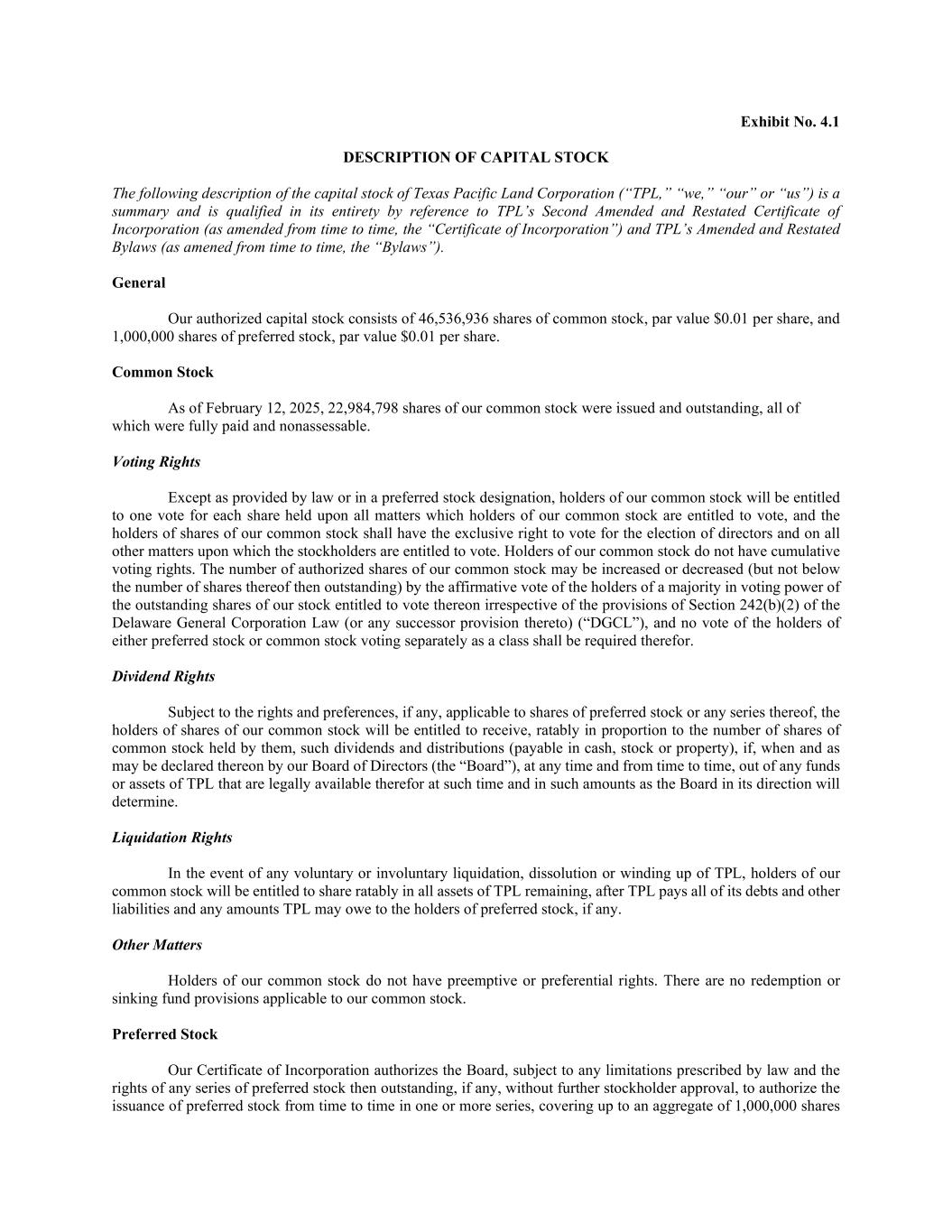 Exhibit No. 4.1 DESCRIPTION OF CAPITAL STOCK The following description of the capital stock of Texas Pacific Land Corporation (“TPL,” “we,” “our” or “us”) is a summary and is qualified in its entirety by reference to TPL’s Second Amended and Restated Certificate of Incorporation (as amended from time to time, the “Certificate of Incorporation”) and TPL’s Amended and Restated Bylaws (as amened from time to time, the “Bylaws”). General Our authorized capital stock consists of 46,536,936 shares of common stock, par value $0.01 per share, and 1,000,000 shares of preferred stock, par value $0.01 per share. Common Stock As of February 12, 2025, 22,984,798 shares of our common stock were issued and outstanding, all of which were fully paid and nonassessable. Voting Rights Except as provided by law or in a preferred stock designation, holders of our common stock will be entitled to one vote for each share held upon all matters which holders of our common stock are entitled to vote, and the holders of shares of our common stock shall have the exclusive right to vote for the election of directors and on all other matters upon which the stockholders are entitled to vote. Holders of our common stock do not have cumulative voting rights. The number of authorized shares of our common stock may be increased or decreased (but not below the number of shares thereof then outstanding) by the affirmative vote of the holders of a majority in voting power of the outstanding shares of our stock entitled to vote thereon irrespective of the provisions of Section 242(b)(2) of the Delaware General Corporation Law (or any successor provision thereto) (“DGCL”), and no vote of the holders of either preferred stock or common stock voting separately as a class shall be required therefor. Dividend Rights Subject to the rights and preferences, if any, applicable to shares of preferred stock or any series thereof, the holders of shares of our common stock will be entitled to receive, ratably in proportion to the number of shares of common stock held by them, such dividends and distributions (payable in cash, stock or property), if, when and as may be declared thereon by our Board of Directors (the “Board”), at any time and from time to time, out of any funds or assets of TPL that are legally available therefor at such time and in such amounts as the Board in its direction will determine. Liquidation Rights In the event of any voluntary or involuntary liquidation, dissolution or winding up of TPL, holders of our common stock will be entitled to share ratably in all assets of TPL remaining, after TPL pays all of its debts and other liabilities and any amounts TPL may owe to the holders of preferred stock, if any. Other Matters Holders of our common stock do not have preemptive or preferential rights. There are no redemption or sinking fund provisions applicable to our common stock. Preferred Stock Our Certificate of Incorporation authorizes the Board, subject to any limitations prescribed by law and the rights of any series of preferred stock then outstanding, if any, without further stockholder approval, to authorize the issuance of preferred stock from time to time in one or more series, covering up to an aggregate of 1,000,000 shares