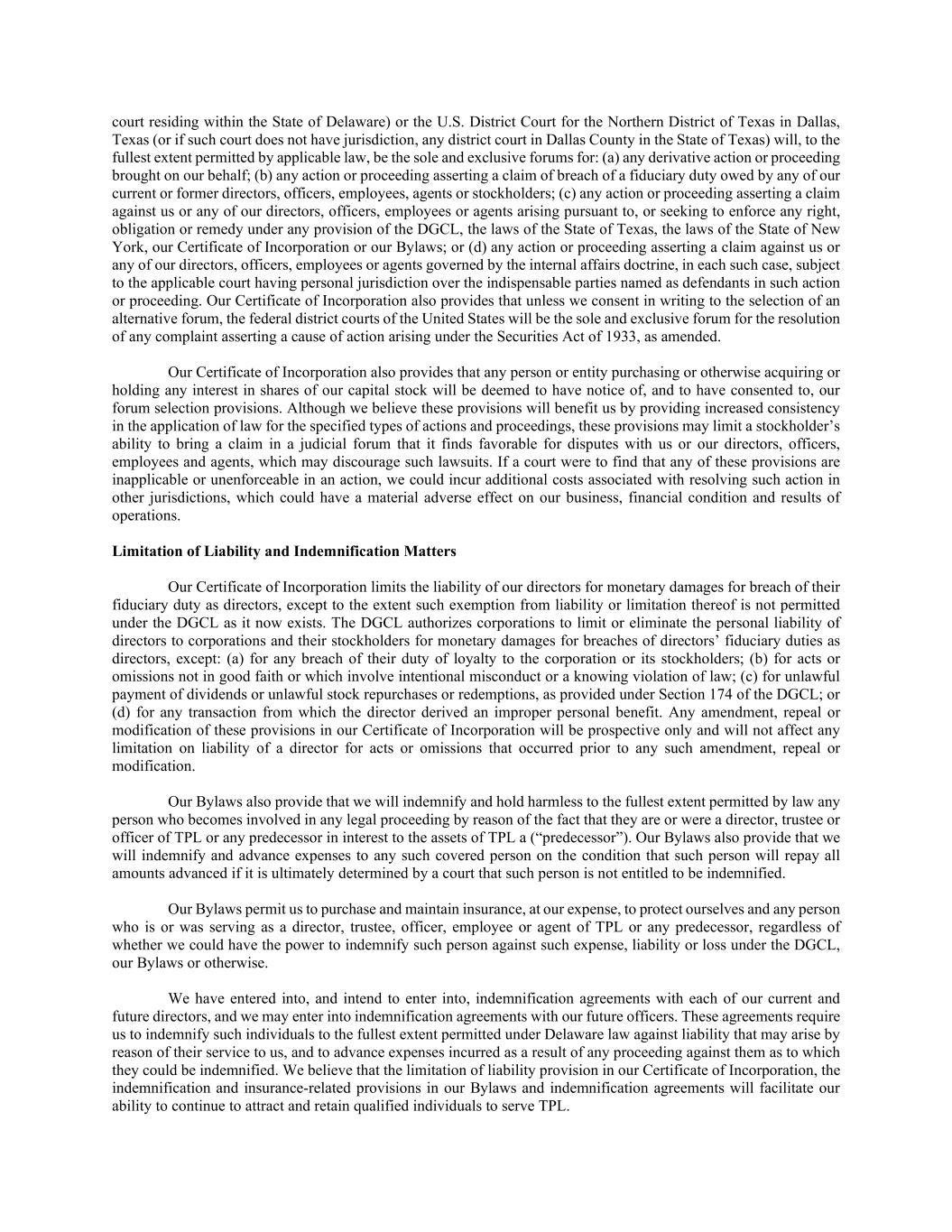 court residing within the State of Delaware) or the U.S. District Court for the Northern District of Texas in Dallas, Texas (or if such court does not have jurisdiction, any district court in Dallas County in the State of Texas) will, to the fullest extent permitted by applicable law, be the sole and exclusive forums for: (a) any derivative action or proceeding brought on our behalf; (b) any action or proceeding asserting a claim of breach of a fiduciary duty owed by any of our current or former directors, officers, employees, agents or stockholders; (c) any action or proceeding asserting a claim against us or any of our directors, officers, employees or agents arising pursuant to, or seeking to enforce any right, obligation or remedy under any provision of the DGCL, the laws of the State of Texas, the laws of the State of New York, our Certificate of Incorporation or our Bylaws; or (d) any action or proceeding asserting a claim against us or any of our directors, officers, employees or agents governed by the internal affairs doctrine, in each such case, subject to the applicable court having personal jurisdiction over the indispensable parties named as defendants in such action or proceeding. Our Certificate of Incorporation also provides that unless we consent in writing to the selection of an alternative forum, the federal district courts of the United States will be the sole and exclusive forum for the resolution of any complaint asserting a cause of action arising under the Securities Act of 1933, as amended. Our Certificate of Incorporation also provides that any person or entity purchasing or otherwise acquiring or holding any interest in shares of our capital stock will be deemed to have notice of, and to have consented to, our forum selection provisions. Although we believe these provisions will benefit us by providing increased consistency in the application of law for the specified types of actions and proceedings, these provisions may limit a stockholder’s ability to bring a claim in a judicial forum that it finds favorable for disputes with us or our directors, officers, employees and agents, which may discourage such lawsuits. If a court were to find that any of these provisions are inapplicable or unenforceable in an action, we could incur additional costs associated with resolving such action in other jurisdictions, which could have a material adverse effect on our business, financial condition and results of operations. Limitation of Liability and Indemnification Matters Our Certificate of Incorporation limits the liability of our directors for monetary damages for breach of their fiduciary duty as directors, except to the extent such exemption from liability or limitation thereof is not permitted under the DGCL as it now exists. The DGCL authorizes corporations to limit or eliminate the personal liability of directors to corporations and their stockholders for monetary damages for breaches of directors’ fiduciary duties as directors, except: (a) for any breach of their duty of loyalty to the corporation or its stockholders; (b) for acts or omissions not in good faith or which involve intentional misconduct or a knowing violation of law; (c) for unlawful payment of dividends or unlawful stock repurchases or redemptions, as provided under Section 174 of the DGCL; or (d) for any transaction from which the director derived an improper personal benefit. Any amendment, repeal or modification of these provisions in our Certificate of Incorporation will be prospective only and will not affect any limitation on liability of a director for acts or omissions that occurred prior to any such amendment, repeal or modification. Our Bylaws also provide that we will indemnify and hold harmless to the fullest extent permitted by law any person who becomes involved in any legal proceeding by reason of the fact that they are or were a director, trustee or officer of TPL or any predecessor in interest to the assets of TPL a (“predecessor”). Our Bylaws also provide that we will indemnify and advance expenses to any such covered person on the condition that such person will repay all amounts advanced if it is ultimately determined by a court that such person is not entitled to be indemnified. Our Bylaws permit us to purchase and maintain insurance, at our expense, to protect ourselves and any person who is or was serving as a director, trustee, officer, employee or agent of TPL or any predecessor, regardless of whether we could have the power to indemnify such person against such expense, liability or loss under the DGCL, our Bylaws or otherwise. We have entered into, and intend to enter into, indemnification agreements with each of our current and future directors, and we may enter into indemnification agreements with our future officers. These agreements require us to indemnify such individuals to the fullest extent permitted under Delaware law against liability that may arise by reason of their service to us, and to advance expenses incurred as a result of any proceeding against them as to which they could be indemnified. We believe that the limitation of liability provision in our Certificate of Incorporation, the indemnification and insurance-related provisions in our Bylaws and indemnification agreements will facilitate our ability to continue to attract and retain qualified individuals to serve TPL.