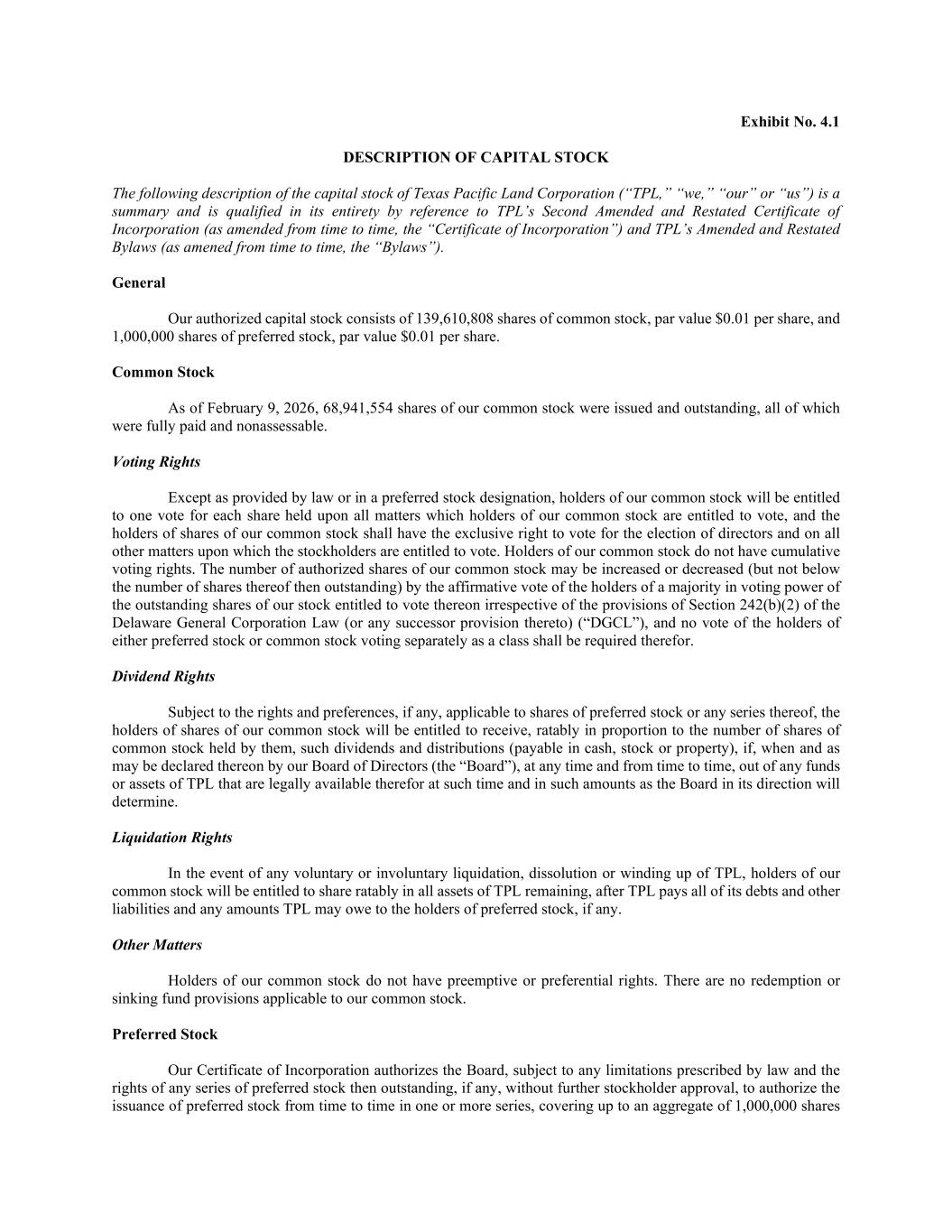 Exhibit No. 4.1 DESCRIPTION OF CAPITAL STOCK The following description of the capital stock of Texas Pacific Land Corporation (“TPL,” “we,” “our” or “us”) is a summary and is qualified in its entirety by reference to TPL’s Second Amended and Restated Certificate of Incorporation (as amended from time to time, the “Certificate of Incorporation”) and TPL’s Amended and Restated Bylaws (as amened from time to time, the “Bylaws”). General Our authorized capital stock consists of 139,610,808 shares of common stock, par value $0.01 per share, and 1,000,000 shares of preferred stock, par value $0.01 per share. Common Stock As of February 9, 2026, 68,941,554 shares of our common stock were issued and outstanding, all of which were fully paid and nonassessable. Voting Rights Except as provided by law or in a preferred stock designation, holders of our common stock will be entitled to one vote for each share held upon all matters which holders of our common stock are entitled to vote, and the holders of shares of our common stock shall have the exclusive right to vote for the election of directors and on all other matters upon which the stockholders are entitled to vote. Holders of our common stock do not have cumulative voting rights. The number of authorized shares of our common stock may be increased or decreased (but not below the number of shares thereof then outstanding) by the affirmative vote of the holders of a majority in voting power of the outstanding shares of our stock entitled to vote thereon irrespective of the provisions of Section 242(b)(2) of the Delaware General Corporation Law (or any successor provision thereto) (“DGCL”), and no vote of the holders of either preferred stock or common stock voting separately as a class shall be required therefor. Dividend Rights Subject to the rights and preferences, if any, applicable to shares of preferred stock or any series thereof, the holders of shares of our common stock will be entitled to receive, ratably in proportion to the number of shares of common stock held by them, such dividends and distributions (payable in cash, stock or property), if, when and as may be declared thereon by our Board of Directors (the “Board”), at any time and from time to time, out of any funds or assets of TPL that are legally available therefor at such time and in such amounts as the Board in its direction will determine. Liquidation Rights In the event of any voluntary or involuntary liquidation, dissolution or winding up of TPL, holders of our common stock will be entitled to share ratably in all assets of TPL remaining, after TPL pays all of its debts and other liabilities and any amounts TPL may owe to the holders of preferred stock, if any. Other Matters Holders of our common stock do not have preemptive or preferential rights. There are no redemption or sinking fund provisions applicable to our common stock. Preferred Stock Our Certificate of Incorporation authorizes the Board, subject to any limitations prescribed by law and the rights of any series of preferred stock then outstanding, if any, without further stockholder approval, to authorize the issuance of preferred stock from time to time in one or more series, covering up to an aggregate of 1,000,000 shares