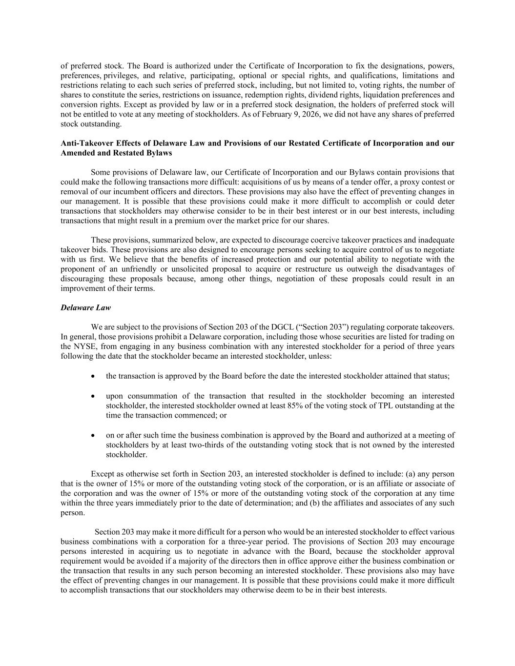 of preferred stock. The Board is authorized under the Certificate of Incorporation to fix the designations, powers, preferences, privileges, and relative, participating, optional or special rights, and qualifications, limitations and restrictions relating to each such series of preferred stock, including, but not limited to, voting rights, the number of shares to constitute the series, restrictions on issuance, redemption rights, dividend rights, liquidation preferences and conversion rights. Except as provided by law or in a preferred stock designation, the holders of preferred stock will not be entitled to vote at any meeting of stockholders. As of February 9, 2026, we did not have any shares of preferred stock outstanding. Anti-Takeover Effects of Delaware Law and Provisions of our Restated Certificate of Incorporation and our Amended and Restated Bylaws Some provisions of Delaware law, our Certificate of Incorporation and our Bylaws contain provisions that could make the following transactions more difficult: acquisitions of us by means of a tender offer, a proxy contest or removal of our incumbent officers and directors. These provisions may also have the effect of preventing changes in our management. It is possible that these provisions could make it more difficult to accomplish or could deter transactions that stockholders may otherwise consider to be in their best interest or in our best interests, including transactions that might result in a premium over the market price for our shares. These provisions, summarized below, are expected to discourage coercive takeover practices and inadequate takeover bids. These provisions are also designed to encourage persons seeking to acquire control of us to negotiate with us first. We believe that the benefits of increased protection and our potential ability to negotiate with the proponent of an unfriendly or unsolicited proposal to acquire or restructure us outweigh the disadvantages of discouraging these proposals because, among other things, negotiation of these proposals could result in an improvement of their terms. Delaware Law We are subject to the provisions of Section 203 of the DGCL (“Section 203”) regulating corporate takeovers. In general, those provisions prohibit a Delaware corporation, including those whose securities are listed for trading on the NYSE, from engaging in any business combination with any interested stockholder for a period of three years following the date that the stockholder became an interested stockholder, unless: • the transaction is approved by the Board before the date the interested stockholder attained that status; • upon consummation of the transaction that resulted in the stockholder becoming an interested stockholder, the interested stockholder owned at least 85% of the voting stock of TPL outstanding at the time the transaction commenced; or • on or after such time the business combination is approved by the Board and authorized at a meeting of stockholders by at least two-thirds of the outstanding voting stock that is not owned by the interested stockholder. Except as otherwise set forth in Section 203, an interested stockholder is defined to include: (a) any person that is the owner of 15% or more of the outstanding voting stock of the corporation, or is an affiliate or associate of the corporation and was the owner of 15% or more of the outstanding voting stock of the corporation at any time within the three years immediately prior to the date of determination; and (b) the affiliates and associates of any such person. Section 203 may make it more difficult for a person who would be an interested stockholder to effect various business combinations with a corporation for a three-year period. The provisions of Section 203 may encourage persons interested in acquiring us to negotiate in advance with the Board, because the stockholder approval requirement would be avoided if a majority of the directors then in office approve either the business combination or the transaction that results in any such person becoming an interested stockholder. These provisions also may have the effect of preventing changes in our management. It is possible that these provisions could make it more difficult to accomplish transactions that our stockholders may otherwise deem to be in their best interests.