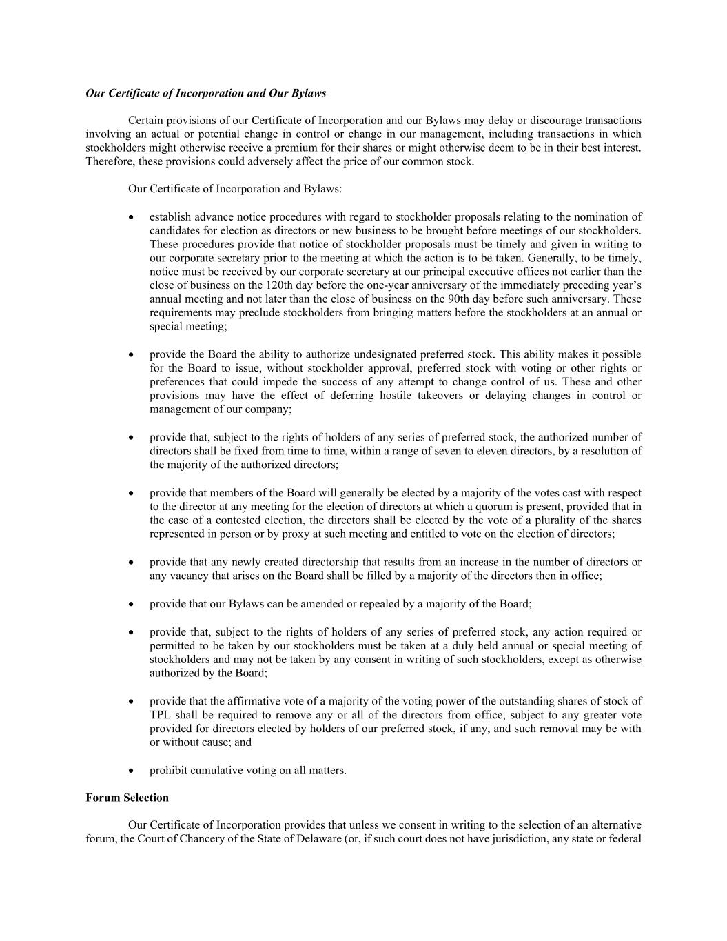 Our Certificate of Incorporation and Our Bylaws Certain provisions of our Certificate of Incorporation and our Bylaws may delay or discourage transactions involving an actual or potential change in control or change in our management, including transactions in which stockholders might otherwise receive a premium for their shares or might otherwise deem to be in their best interest. Therefore, these provisions could adversely affect the price of our common stock. Our Certificate of Incorporation and Bylaws: • establish advance notice procedures with regard to stockholder proposals relating to the nomination of candidates for election as directors or new business to be brought before meetings of our stockholders. These procedures provide that notice of stockholder proposals must be timely and given in writing to our corporate secretary prior to the meeting at which the action is to be taken. Generally, to be timely, notice must be received by our corporate secretary at our principal executive offices not earlier than the close of business on the 120th day before the one-year anniversary of the immediately preceding year’s annual meeting and not later than the close of business on the 90th day before such anniversary. These requirements may preclude stockholders from bringing matters before the stockholders at an annual or special meeting; • provide the Board the ability to authorize undesignated preferred stock. This ability makes it possible for the Board to issue, without stockholder approval, preferred stock with voting or other rights or preferences that could impede the success of any attempt to change control of us. These and other provisions may have the effect of deferring hostile takeovers or delaying changes in control or management of our company; • provide that, subject to the rights of holders of any series of preferred stock, the authorized number of directors shall be fixed from time to time, within a range of seven to eleven directors, by a resolution of the majority of the authorized directors; • provide that members of the Board will generally be elected by a majority of the votes cast with respect to the director at any meeting for the election of directors at which a quorum is present, provided that in the case of a contested election, the directors shall be elected by the vote of a plurality of the shares represented in person or by proxy at such meeting and entitled to vote on the election of directors; • provide that any newly created directorship that results from an increase in the number of directors or any vacancy that arises on the Board shall be filled by a majority of the directors then in office; • provide that our Bylaws can be amended or repealed by a majority of the Board; • provide that, subject to the rights of holders of any series of preferred stock, any action required or permitted to be taken by our stockholders must be taken at a duly held annual or special meeting of stockholders and may not be taken by any consent in writing of such stockholders, except as otherwise authorized by the Board; • provide that the affirmative vote of a majority of the voting power of the outstanding shares of stock of TPL shall be required to remove any or all of the directors from office, subject to any greater vote provided for directors elected by holders of our preferred stock, if any, and such removal may be with or without cause; and • prohibit cumulative voting on all matters. Forum Selection Our Certificate of Incorporation provides that unless we consent in writing to the selection of an alternative forum, the Court of Chancery of the State of Delaware (or, if such court does not have jurisdiction, any state or federal
